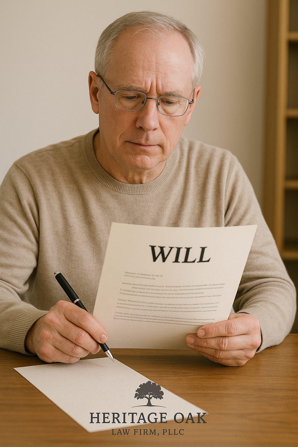 An older man with glasses reads a document titled 'Will' at a wooden table, with a paper bearing the logo 'Heritage Oak Law Firm, PLLC' in front of him.